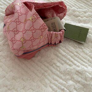 Sweet and stylish with a dash of Gucci charm, this brand-new silk headband is the prettiest way to top off your look. Made in Italy from silky-smooth fabric, it features the iconic GG print and dainty Horsebit details in the dreamiest pink and sky blue combo. The cute front knot gives it a playful twist, while the comfy elastic back keeps it snug all day. Whether you're dressing up or just adding a little flair, this headband is your new go-to for instant cuteness and luxury.