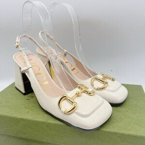 Gucci GG Slingback Horsebit Pumps Chunk Heel Heels Mystic White Leather