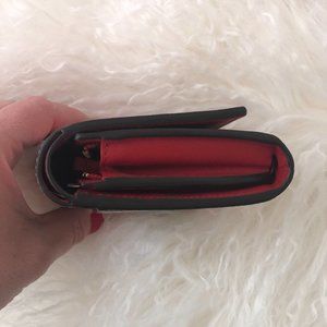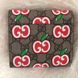 Gucci GG Supreme Canvas Apple French Wallet is crafted from GG Supreme canvas and features a snap fastening, red, white and green printed logo pattern and a slip pocket at the back. It also has a bill compartment, zipped coin pocket, slip pocket and four card slots inside.