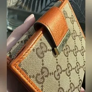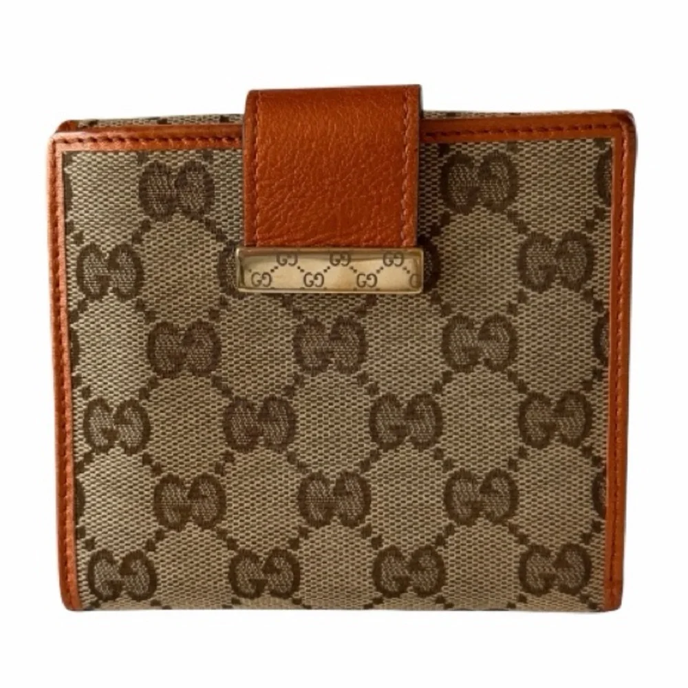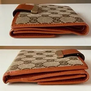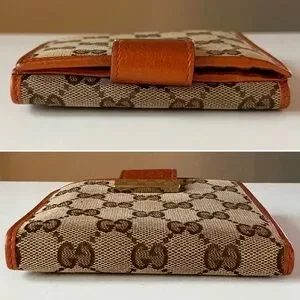 Authentic Gucci GG Supreme Canvas Bifold Wallet, in GG Supreme coated canvas with iridescent orange leather trim.
