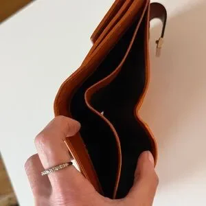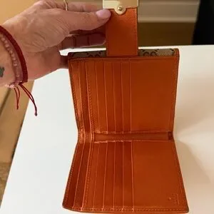 Very good overall condition. Canvas is clean and presents beautifully. Interior leather is clean with light wear inside the coin compartment, as shown. Corners and edges show minimal wear consistent with gentle use. Hardware retains a nice appearance, and the wallet remains structured and fully functional.