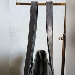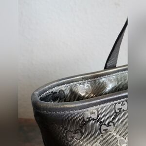 Metallic coated canvas with leather straps and trim. Exterior shows minor wear, some darkening at corners and wear on leather. Interior is clean. Measures 11x9x4"