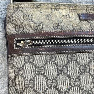 Gucci GG Supreme crossbody bag. Beautiful monogram canvas. Dark brown leather trim and cloth adjustable shoulder straps. Front zipper and top closure. Woven linen interior.