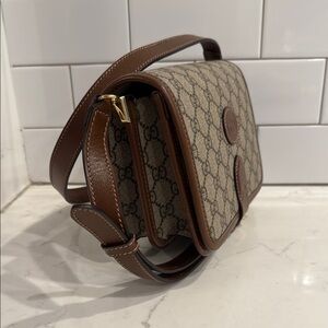 Experience timeless elegance with this Gucci crossbody bag, crafted in a rich brown hue. The iconic GG monogram canvas is complemented by luxurious leather trim, showcasing Gucci's heritage craftsmanship. Its adjustable shoulder strap ensures comfort and versatility, making it a perfect accessory for any occasion.