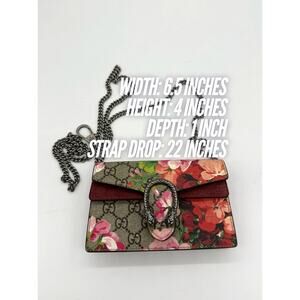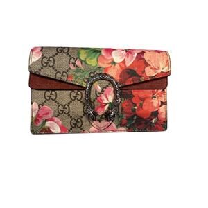 The iconic Dionysus is made of coated GG canvas and beautiful suede. It has a built in Gucci branded chain that is removable. This can be a clutch or a wallet on chain. Gorgeous bag and in the Blooms special edition print.