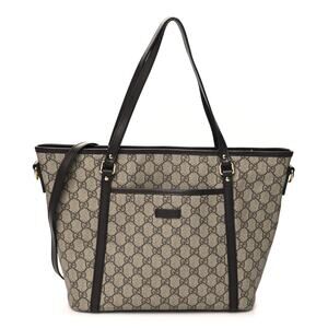 This stylish tote is crafted of Gucci GG supreme monogram canvas. The bag features dark brown leather strap handles including matching leather trim, front and rear patch pockets, and polished light gold hardware. The top zipper opens to a dark brown fabric interior with zipper and patch pockets.