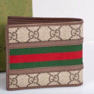 Authentic GUCCI GG Supreme Monogram Web Mens Ophidia Bi-Fold Coin Wallet in Beige and New Acero. This stylish bi-fold wallet is crafted of Gucci GG monogram coated canvas with a green and red web stripe and brown leather trim. This wallet features an aged gold Gucci GG logo and opens to a brown leather interior with card slots, patch pockets, and a bill compartment.