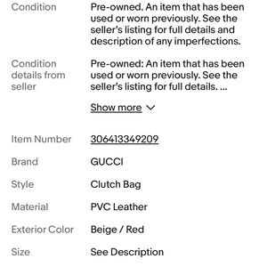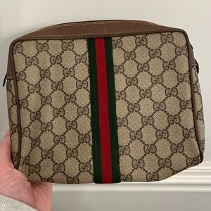 Stylish Gucci toiletry bag or clutch with iconic GG pattern. Features brown design with green and red stripe. Bought from trusted Japanese seller “Brandstreet.tokyo”. Paid $130. Honestly not what I was looking for in a makeup bag. Inside is dusty and smells old. Condition reflected in price.