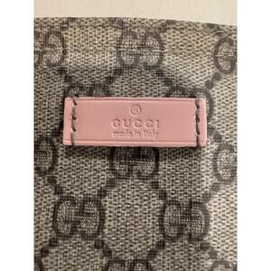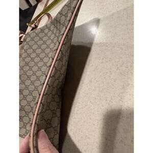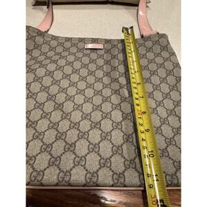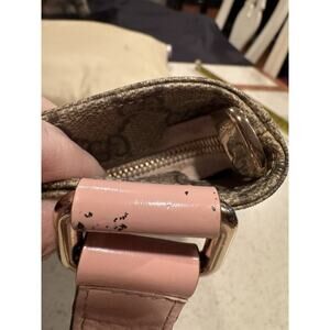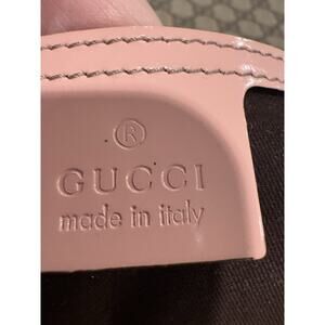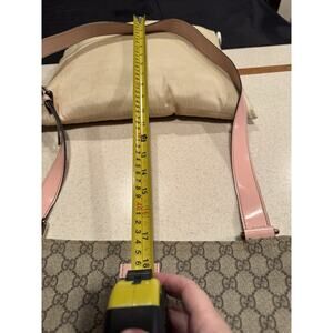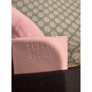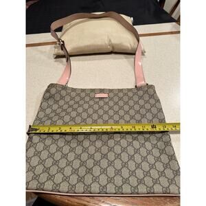 The Gucci GG Supreme messenger bag features a stylish pink patent leather trim and strap, adding a touch of luxury to the classic design. The large size and leather trim make it practical and comfortable to carry, while the adjustable strap ensures a perfect fit. The pink trim color and tan logo pattern give it a feminine and trendy look, perfect for any fashion-forward woman. With the reputable Gucci brand name and high-quality materials, this messenger bag is a must-have designer accessory. Includes a certificate of authenticity. Please see the pic with some dark marks on the strap, otherwise is really great shape.