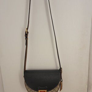 Small Padlock purse. Beige and Leather and push lock closure front. Shoulder strap drop is 21.5", the height of purse is 7.75", the width is 9.25", the depth is 2.25"