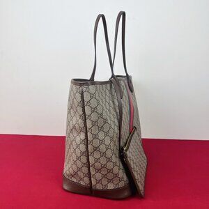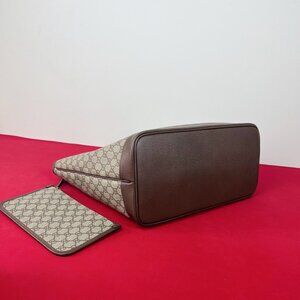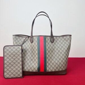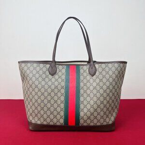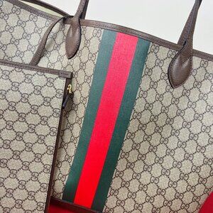 The brand's collections of large GG tote bags uphold the philosophy that pieces shouldn't be limited to a single season, but rather timelessly renew. The iconic monogram, inspired by the Guccio Gucci initials, continues to imbue new designs with the brand's signature allure. This Ophidia tote is crafted from classic beige and ebony GG Supreme canvas and embellished with a red and green striped webbing.