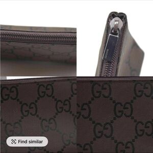 Gucci, GG monogram, canvas and leather cosmetic pouch. Brown. Good condition, minor scuffing on interior.