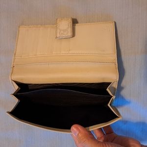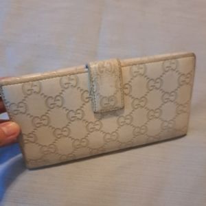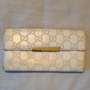 Gucci GG monogram long continental leather wallet, color ivory/ stone white, gold hardware. Plenty of rooms: back coin compartments, bills and cards slots. Has been well loved with signs of use: small scrapes/wound on corners, creases, has some rubs/dirt; gold tone hardware scratches. Please look at all pics as they are part of description. Code 112715.3661. Size approx 7.4" x 4". Open to offers.