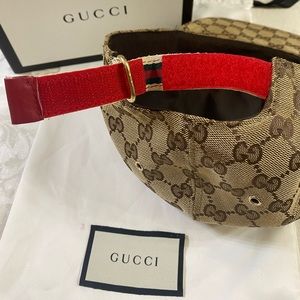 authentic gucci sport cap, GG monogrammed canvas, red trim leather detail, iconic red adjustable strap, silver tone hardware, excellent condition, come with box and dust bag