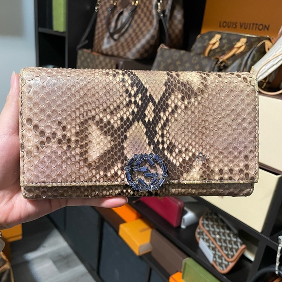 In very good condition with some sign of wears. Comes with box and dust bag. Looks beautiful with wallet insert to wear as a wallet on chain. Brand new gucci python wallet retails for 1200.