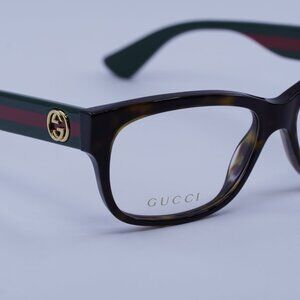 Authentic Gucci GG0278O 012 eyeglasses in havana frame with green/red temples.