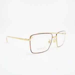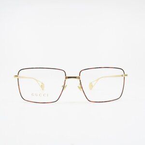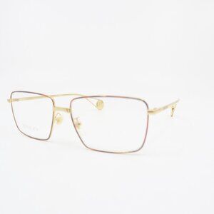 Gucci GG0439O 004 53mm Gold/Gold Metal, New Unisex Eyeglasses Frames. 100% Authentic. The frame color is a very thin line of black and red gloss acetate, with shine gold rims and gold nose bridge metal, adjustable clear nose pads for comfort, lightweight, full rim, square/rectangle style. Temple color is also shine gold metal with Gucci logo and letters engraved at each side. Width/Bridge/Temple size is 53mm 15mm 145mm. Frame is shipped with the Gucci: case, tag, microfiber cloth, dust pouch and the authenticity card. Made in Italy. Case color may vary from picture. nh Box Gucci #3