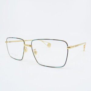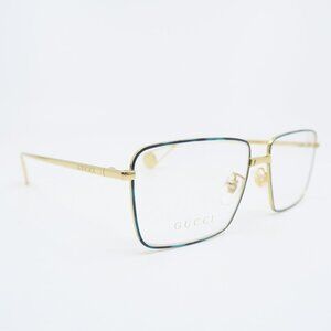 Gucci GG0439O 007 55mm Gold/Gold Metal, New Unisex Eyeglasses Frames. 100% Authentic. The frame color is a very thin line of black and green gloss acetate, gold rims and nose bridge shine metal, adjustable clear nose pads for comfort, lightweight, full rim, square/rectangle style. Temple color is also shine gold metal with Gucci logo and letters engraved at each side. Width/Bridge/Temple size is 55mm 15mm 145mm. Frame is shipped with the Gucci: case, tag, microfiber cloth, dust pouch and the authenticity card. Made in Italy. Case color may vary from picture. nh Box Gucci #3