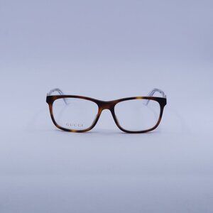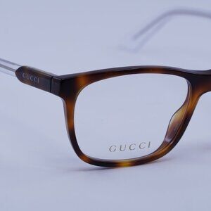 Authentic Gucci GG0490O 003 eyeglasses in Havana/Transparent frame.