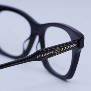Authentic Gucci GG1299O 001 eyeglasses in black frame with studs at the temples.