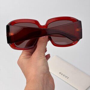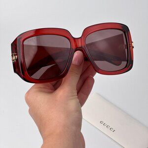 Bold and elegant with a modern twist, the Gucci GG1402S sunglasses are a striking choice for fashion-forward women. This model (GG1402S, color code 003) features a full-rim square frame in a unique transparent burgundy acetate, creating a sophisticated play of color and light. The brown nylon lenses offer 100% UV protection, making them as practical as they are stylish. Finished with signature Gucci temple detailing, these sunglasses effortlessly balance vintage charm with contemporary edge.