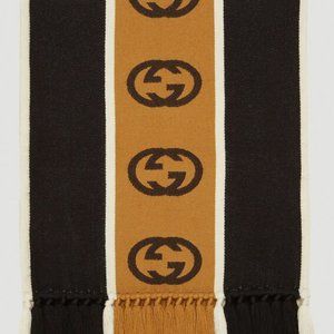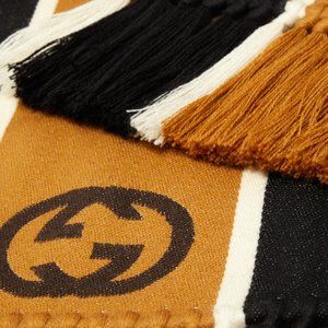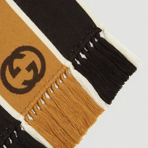 This black scarf features a large tan stripe with white edges with the Interlocking GG logo. The reverse side has the same pattern in a deep brown. The fringed edges create texture for a cozy and refined look.