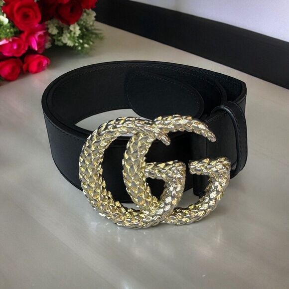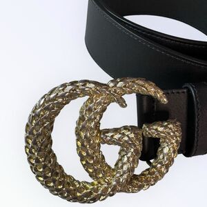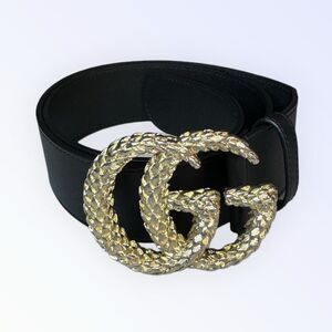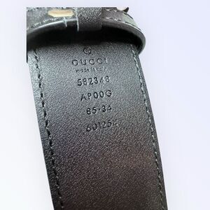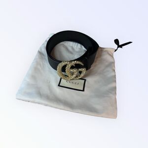 Product: Gucci GG Leather Belt Condition: 9.5/10 - Excellent Used Condition with Minimal Wear Noted Wear: One small bend in leather Measurements: 85 34”; 1.5” width Color: Black & Gold Other: Made in Italy Included: No box. Dust bag included.