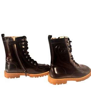 Add luxury to her step 💕 These authentic Gucci girls’ lace-up boots feature smooth black leather, a durable sole, and the iconic GG logo stitched on the side.