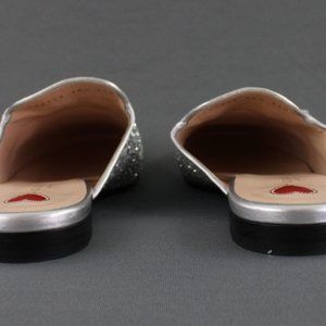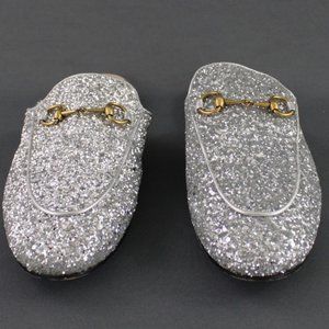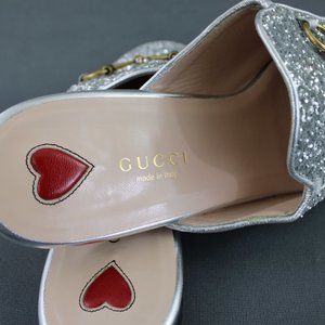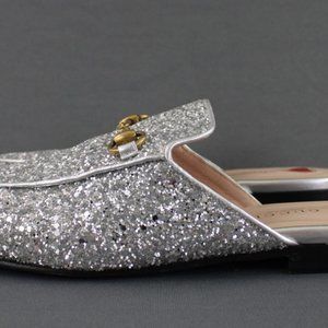 Authentic Gucci Princetown Mules. Shimmering silver mules. Classic and elegant gold Gucci buckle embellishment. Easy slip-on design.