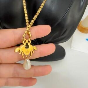 Chic Gucci necklace with a gold bee pendant. Features a pearl drop and sparkling stones on the chain.