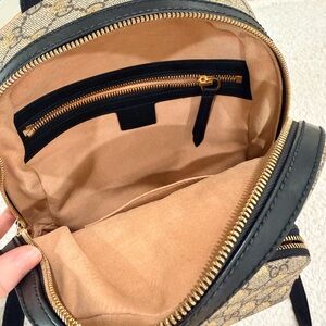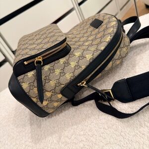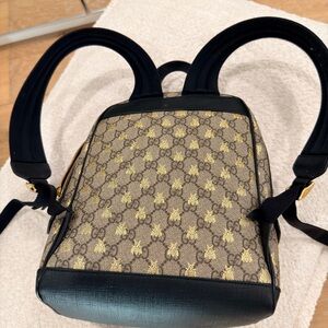 Elegant Gucci backpack with bee motif. Beige and black design. Ideal for daily style.