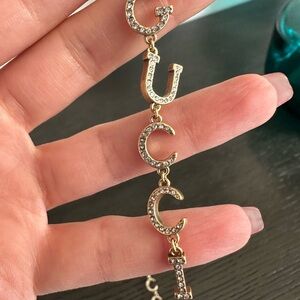 These exquisite Gucci earrings feature a luxurious gold finish and a unique dangle design with the iconic 'GUCCI' text. The letters are arranged vertically in a flowing font creating a sophisticated drop effect. Measuring approximately 3 inches in length, these statement pieces are perfect for adding a touch of elegance to any ensemble.