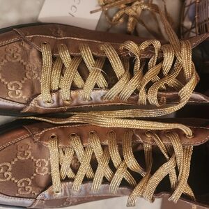 Stylish Gucci high-top sneakers. Features gold monogram design. Perfect for casual wear. The bottom has wear. small cracks. comes with box and extra shoe strings
