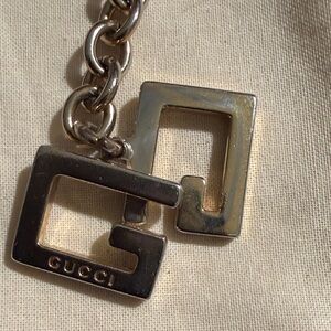 Stylish Gucci keychain with interlocking logo. Sleek gold finish.