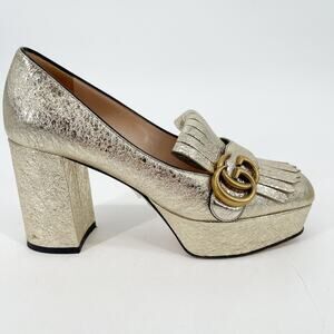 Iconic Gucci GG Marmont platform loafer heels crafted in gold metallic crackled leather (color platino). Designed with a fringed kiltie vamp, signature double G hardware, and bold block heel for retro sophistication. Leather lining and outsole. Includes dust bag and box.