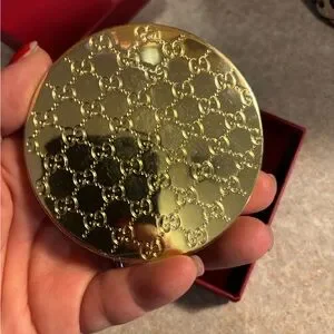 Stylish gold compact with intricate design. Features Gucci branding. Ideal for quick touch-ups.
