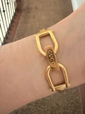 Classic Gucci women's bangle watch with a slim rectangular dial. Polished gold-tone bracelet and matching hands. Minimal face with subtle branding for refined style. 1500 Series Collection. Quartz. Will fit a 5.75 inch wrist or smaller