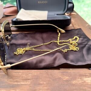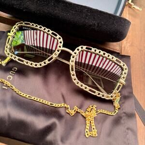 Elevate your style with these luxurious Gucci sunglasses. Featuring a stunning gold frame and a chic chain, these sunglasses are perfect for any fashion-forward wardrobe.