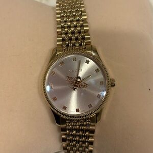 Elegant Gucci watch with a gold bracelet. Features a sleek silver dial. Perfect for any occasion. Need battery
