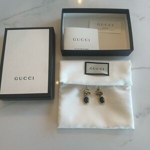 These exquisite Gucci earrings showcase a luxurious blend of gold and black, featuring the iconic interlocking 'GG' logo. The elegant dangle design is highlighted by a smooth black onyx stone, creating a striking contrast. Perfect for adding a touch of sophistication to any ensemble.