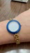 Stylish Gucci Vintage watch with a striking blue bezel. Gold bracelet adds elegance. White dial with minimalist design.