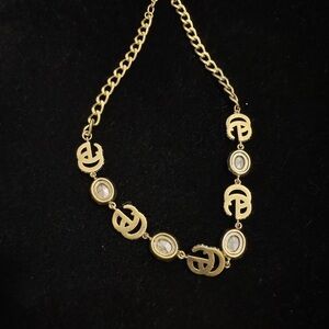 This luxurious Gucci necklace features a captivating design with alternating gold-tone GG logo elements and vibrant emerald green stones. The classic chain construction elegantly showcases the brand's iconic double G motif, creating a sophisticated and timeless piece perfect for any occasion.