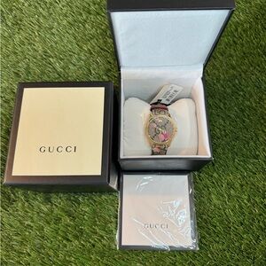 This exquisite Gucci watch showcases a captivating floral design on its face, highlighted by gold and pink hues. The elegant timepiece is crafted with precision, making it a standout accessory for any occasion.