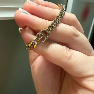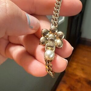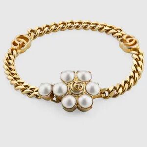 This exquisite Gucci bracelet showcases a harmonious blend of gold and white, featuring delicate pearl-like accents that form a captivating focal point. The gold chain is crafted with precision, offering a luxurious and timeless appeal. Perfect for elevating any ensemble with its sophisticated design.