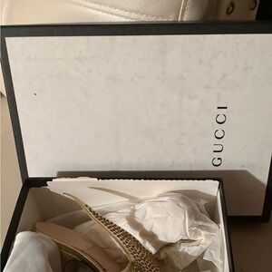 Step out in style with these elegant Gucci gold heels. Perfect for any occasion, these shoes add a touch of glamour to your outfit. 37.5/7.5 with box