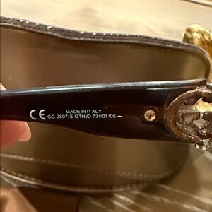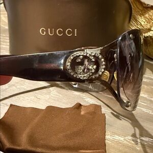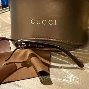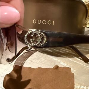 Stylish Gucci sunglasses with a gradient brown tint. There are some scratches on the lenses. I can't get them to show up in an image. As you can see, there is some wear on the right side of the glasses.