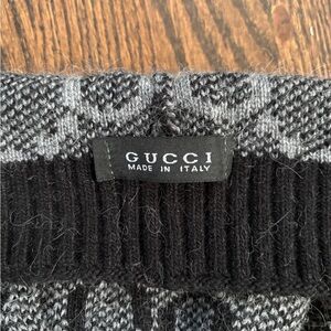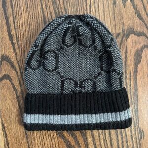 Elevate your winter wardrobe with this luxurious Gucci knit hat, showcasing the iconic GG monogram pattern in a sophisticated gray and black color scheme. Crafted with a ribbed bottom band and subtle white stripe detailing, this accessory combines style and warmth effortlessly. Perfect for adding a touch of elegance to any cold-weather ensemble.