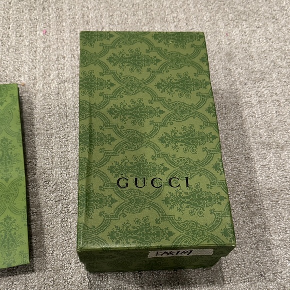 Gucci branded box with ornate green pattern. Elegant printed design on top. Ideal for storing accessories or displaying on a shelf. Shoe box only
