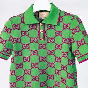 Made in Italy, this dress from Gucci circa 2023 is crafted with a Green jacquard knit patterned in a purple GG monogram, and features short sleeves, ribbed cuffs, a classic polo collar, a ribbed buttoned Henley, an A-line silhouette throughout the bodice, front patch pockets with ribbed trim, and a mini-length hem.