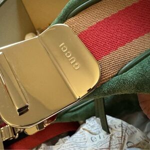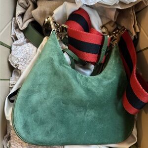 Chic green suede bag with bold red and black strap. Ideal for stylish outings.